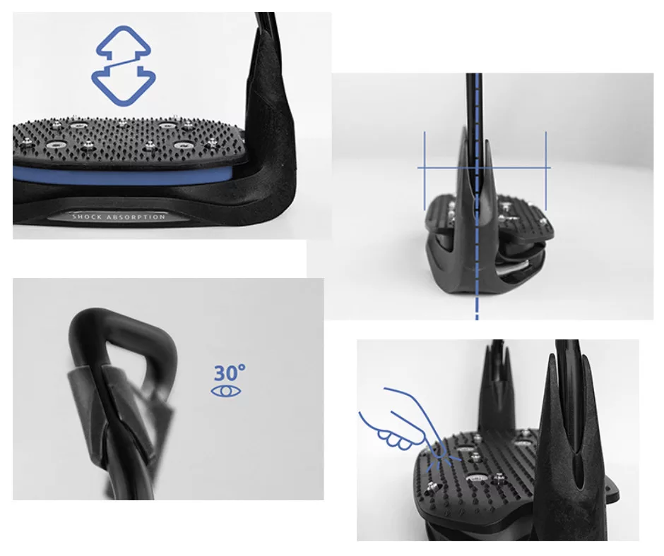 The AIR'S FULL BLACK stirrup offers four technical options to adapt to the needs of each rider. The eye can be oriented at 30° or straight, and the floor can be flat or inclined at 10°.